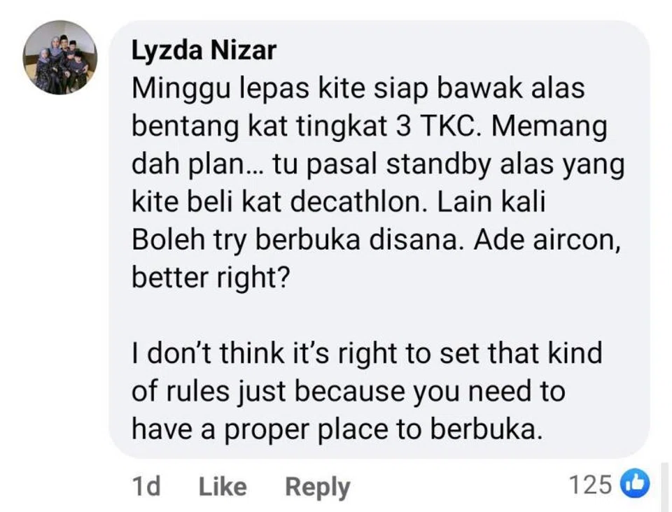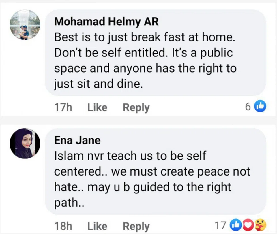 While some agreed that the tables and chairs should be meant for Muslims who need to break their fast, others felt the man was "self-entitled" as the bazaar is a public space.