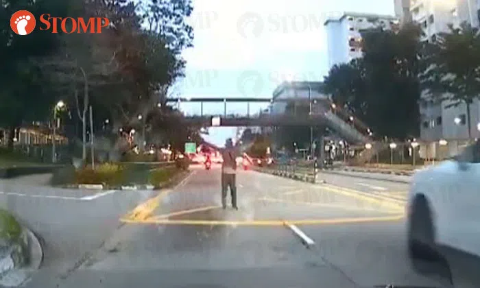 Man staggers onto road and raises arms at oncoming car at Bedok North Road