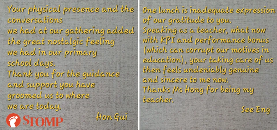 Liew Eng said: "Thank you Stomp for your big help and search for long-lost ones. It is deeply appreciated. We have found 10 people, including our form teacher, and seven of us met up with her for a New Year's Day reunion lunch."