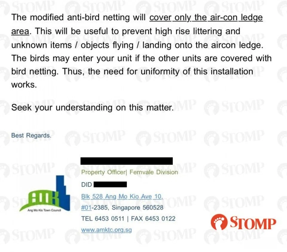 "We are also aware of the concern raised by a resident regarding the bird netting installed. The netting was customised with a zip on one side to allow accessibility for aircon maintenance by residents from time to time.