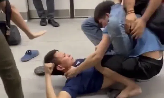Videos of the fight that were circulated on social media on Friday show a man in a dark blue shirt sprawled on the floor of the train, punching and kicking the other man, who is wearing a light blue shirt.