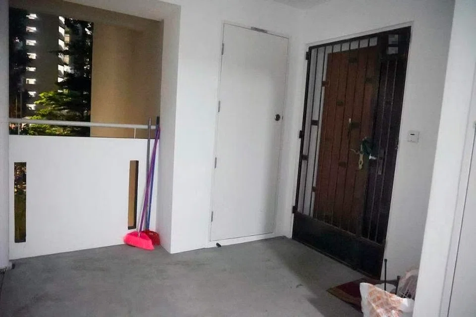 The second-storey unit in Block 228B Ang Mo Kio Street 23 where Ms Isabel Elizabeth Francis was found lying motionless on Jan 11, 2022. PHOTO: SHIN MIN DAILY NEWS