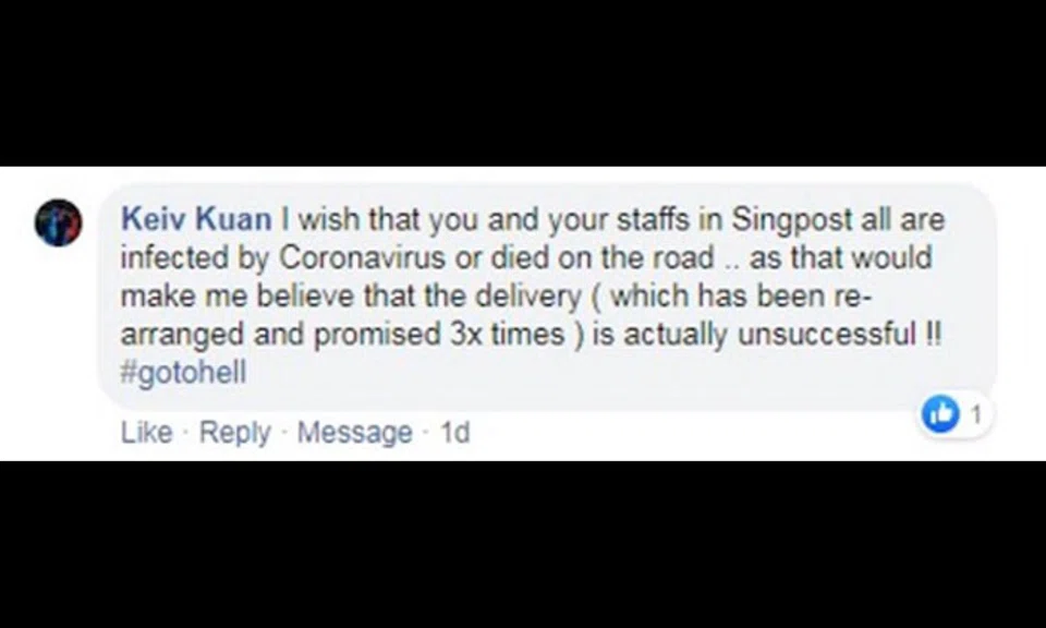 Keiv Kuan wished death and infection by coronavirus on SingPost staff in a Facebook post after his parcel's delivery was unsuccessful.