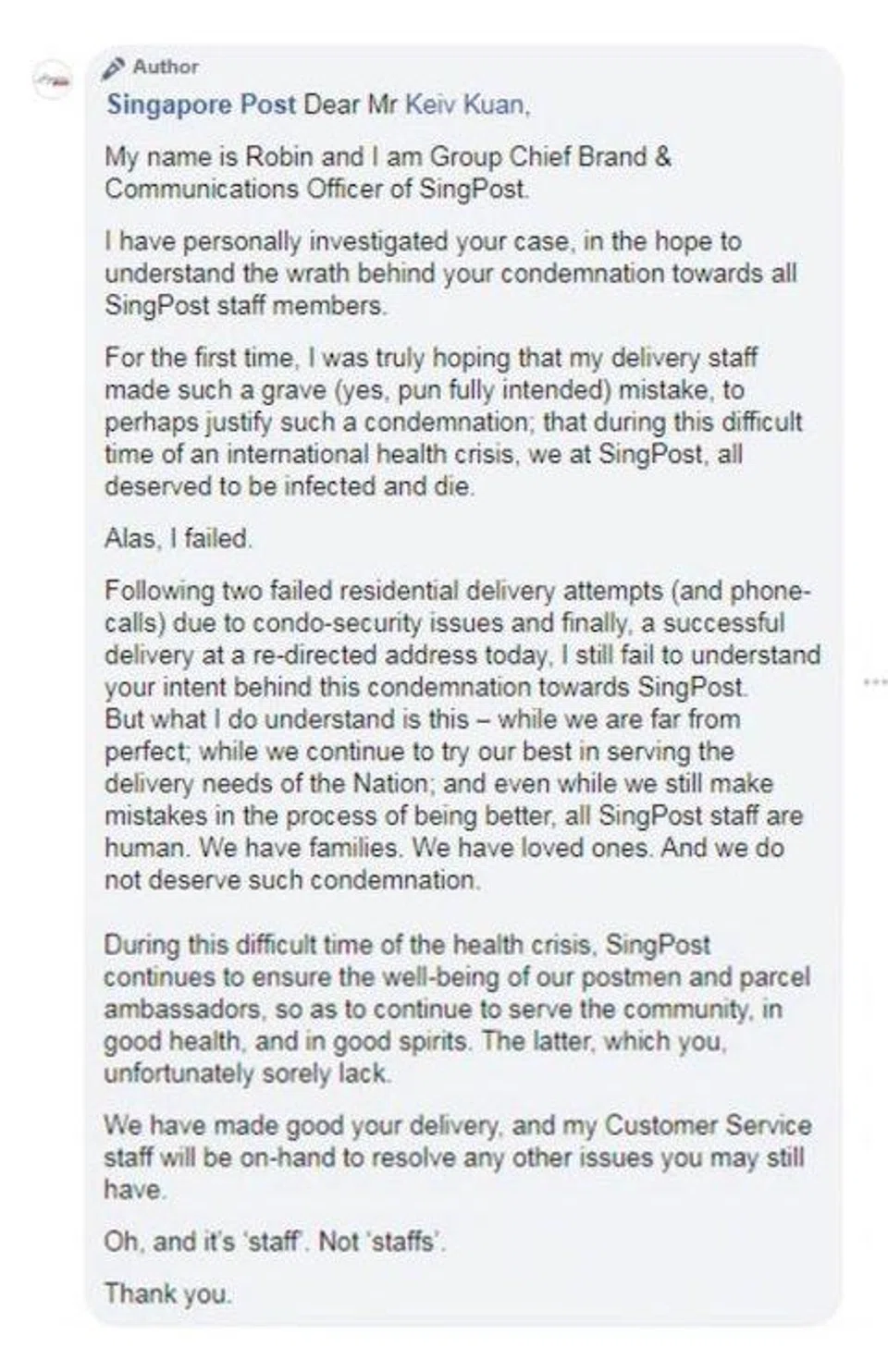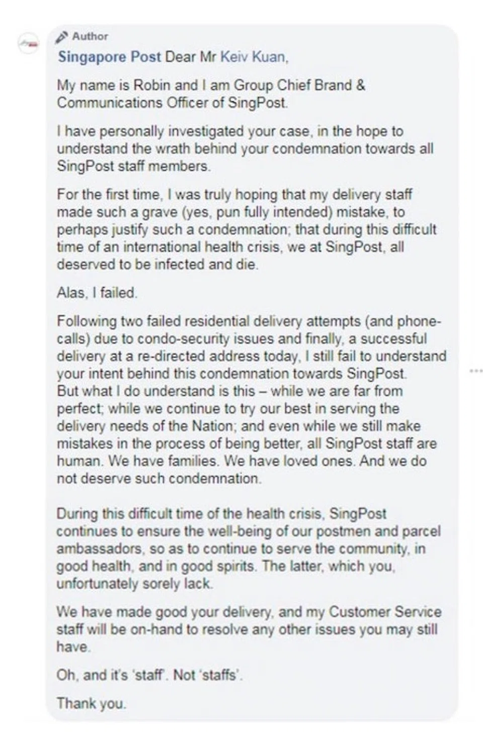 "For the first time, I was truly hoping that my delivery staff made such a grave (yes, pun fully intended) mistake, to perhaps justify such a condemnation; that during this difficult time of an international health crisis, we at SingPost, all deserved to be infected and die.