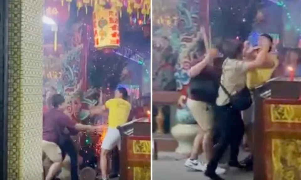 A video of the incident shows the devotee's two companions also pushing and hitting Mr Huang. One of them struck him with a burning incense stick, causing sparks to fly.