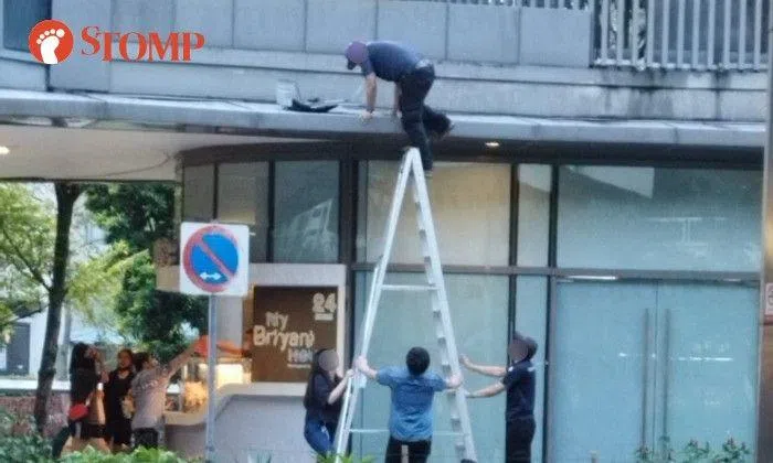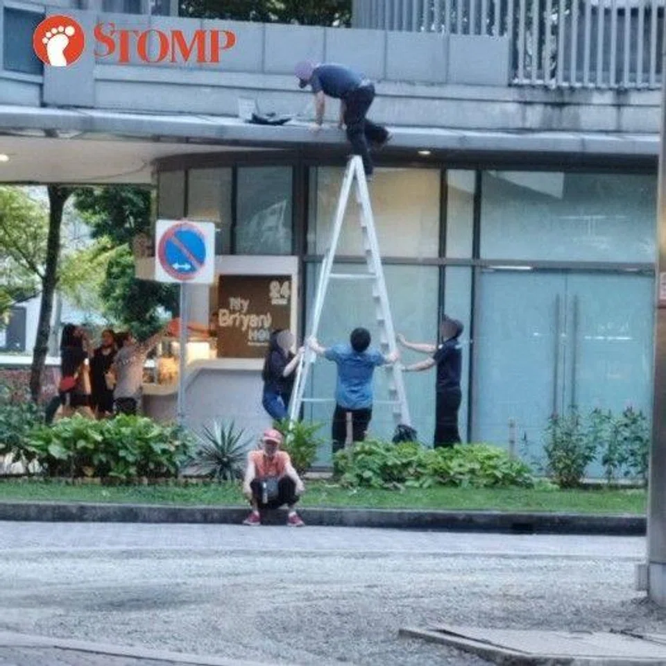 "The guy perched on top of the roof while trying to come down the ladder is part of the maintenance team of Seletar Mall," said the Stomper.