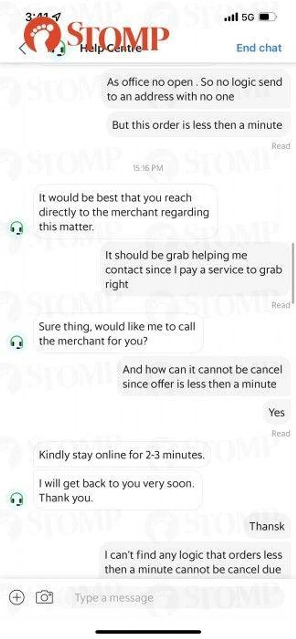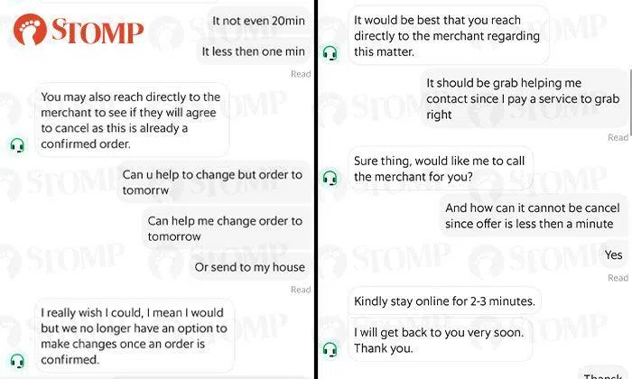 Stomper Jason told Stomp that he contacted GrabFood immediately requesting to change the date or cancel the order but was met with inflexibility from the customer service representative.