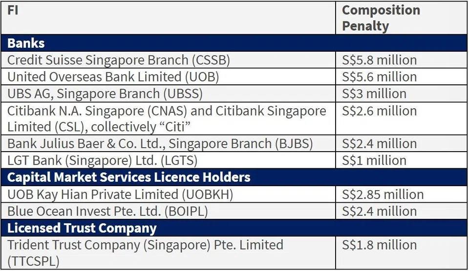 They were among nine financial institutions (FIs) hit with $27.45 million in composition penalties by the Monetary Authority of Singapore (MAS).