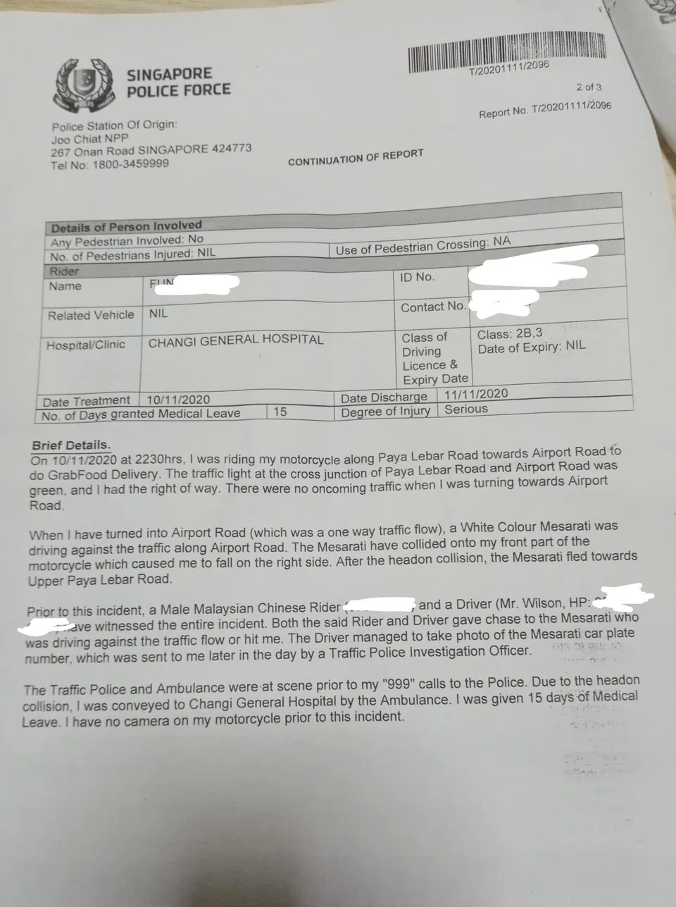 The GrabFood rider also stated in the police report that the traffic light was green and he had the right of way.