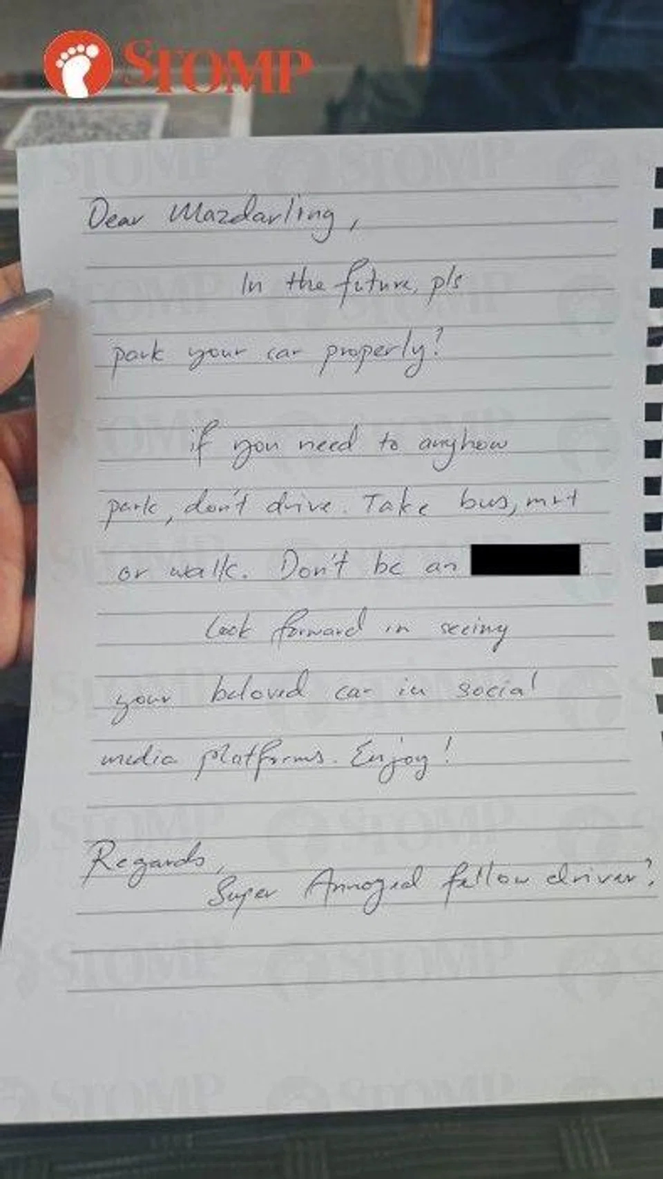 A Mazda driver received a harsh note for poor parking skills at the National University of Singapore (NUS) on May 15.