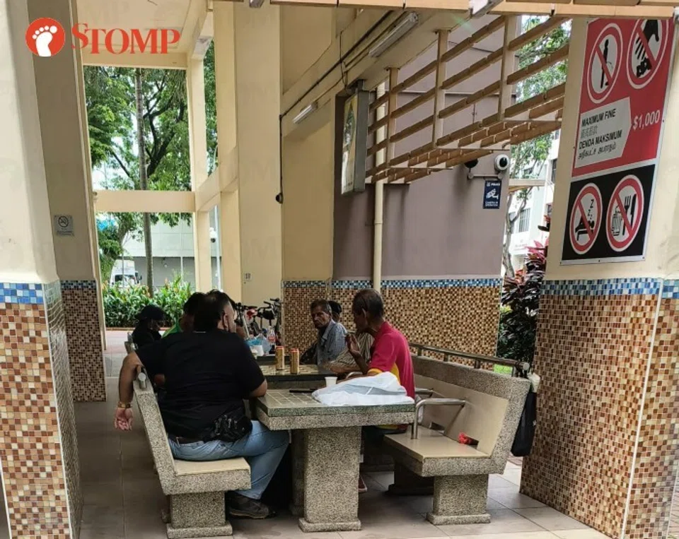 Men smoke and drink in Jalan Besar residents' corner under signs prohibiting smoking and drinking