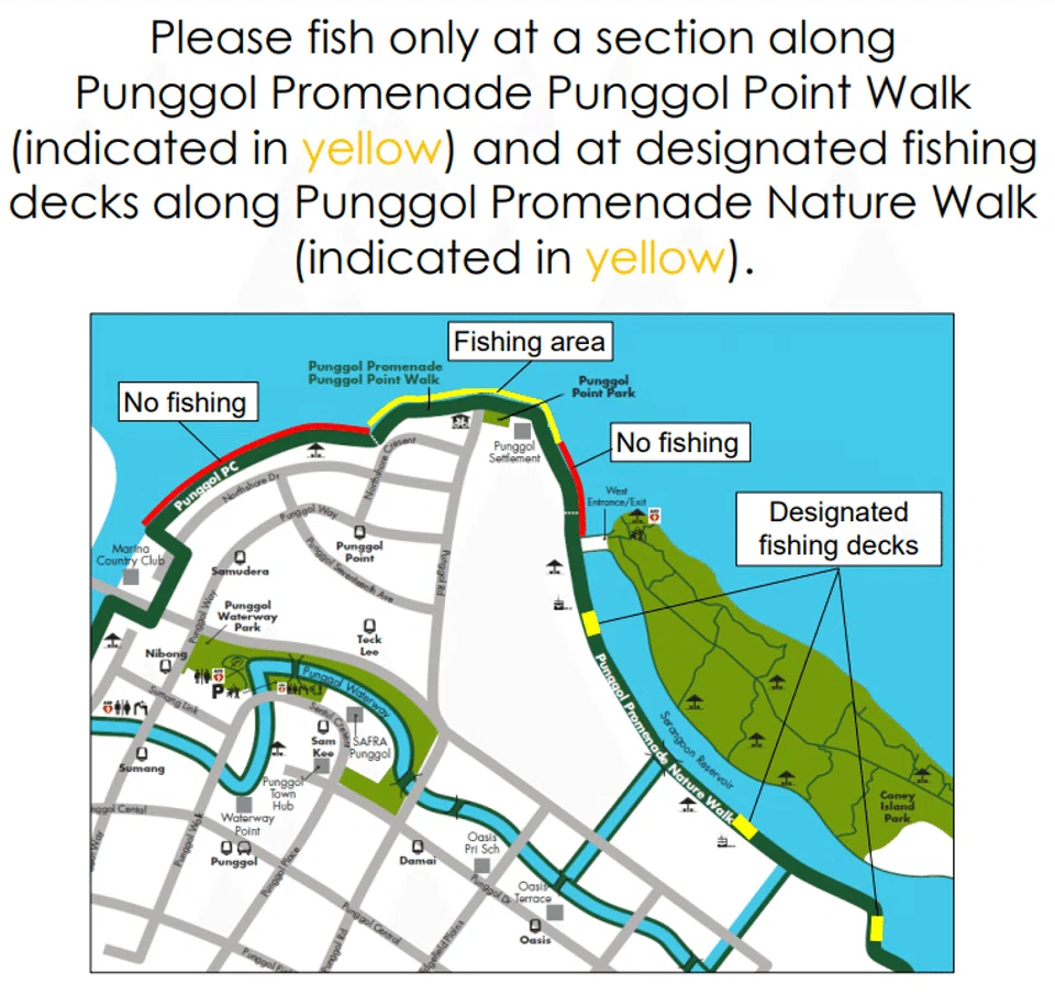 Those who wish to fish may do so at designated points along Punggol Promenade Punggol Point Walk and Punggol Promenade Nature Walk.
