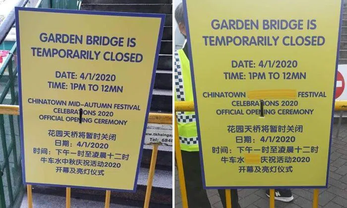 The signboard, which notified members of the public about a temporary closure of the Garden Bridge on Jan 4, stated the event as the official opening ceremony for "Chinatown Mid-Autumn Festival Celebrations 2020".
