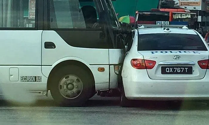 In a photo of the accident's aftermath posted on Singapore Taxi Driver, the front of white minibus can be seen touching or 'kissing' if you will, the left side of the police car.