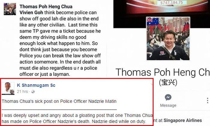 Minister K Shanmugam has expressed his anger over a highly offensive and insensitive Facebook post by Thomas Chua on the death of Traffic Police Staff Sergeant Nadzrie Matin.
