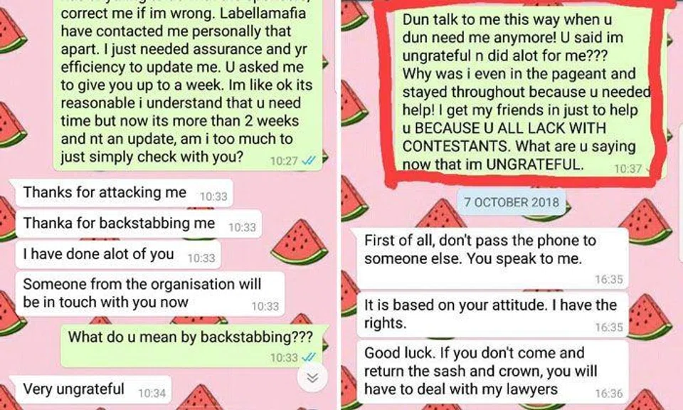 Initially, she censored screenshots of a text conversation she had with a representative of the pageant but in an updated post on Tuesday (Oct 9) she uploaded the original texts.