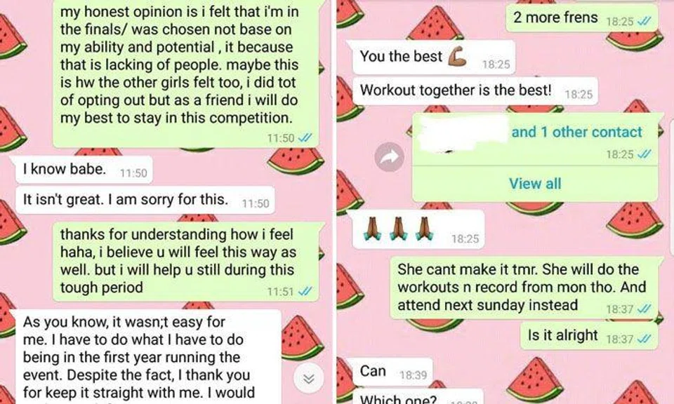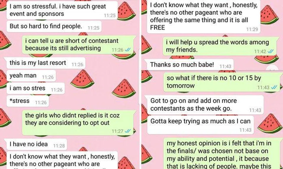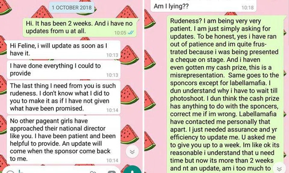 The screenshots also revealed that Feline was friends with this staff member and had actually done her a favour by joining the pageant as it appeared that she was having trouble finding contestants.