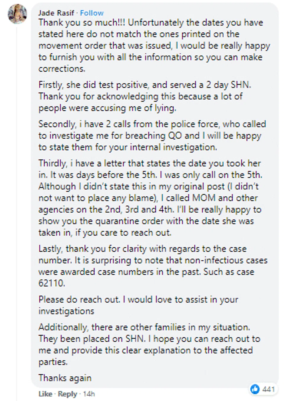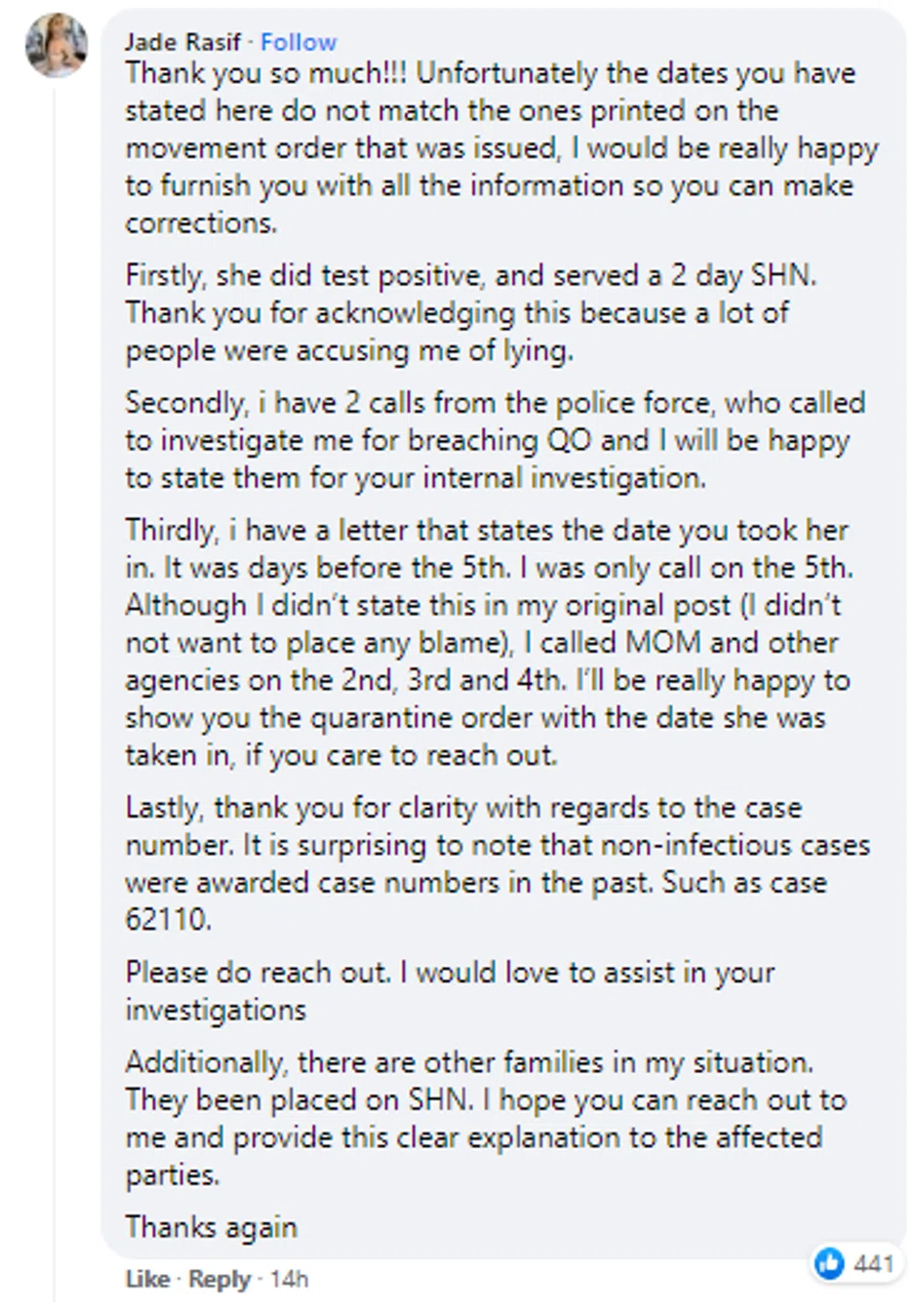 On Monday (May 17), Ms Rasif responded to MOM's post in a Facebook comment, noting that there were other families in similar situations who had been placed on SHN.