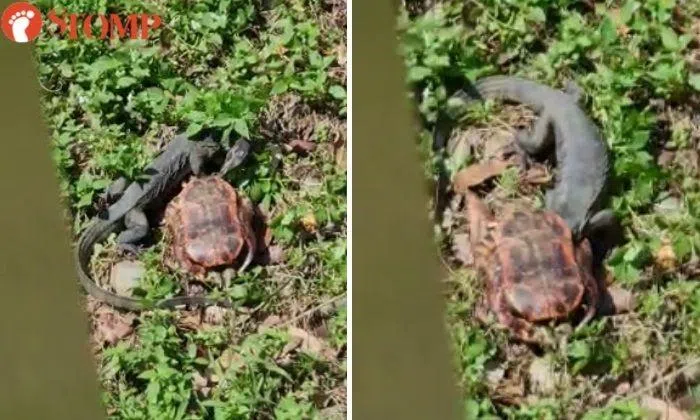 Monitor lizard pokes its head into tortoise shell in Punggol Park