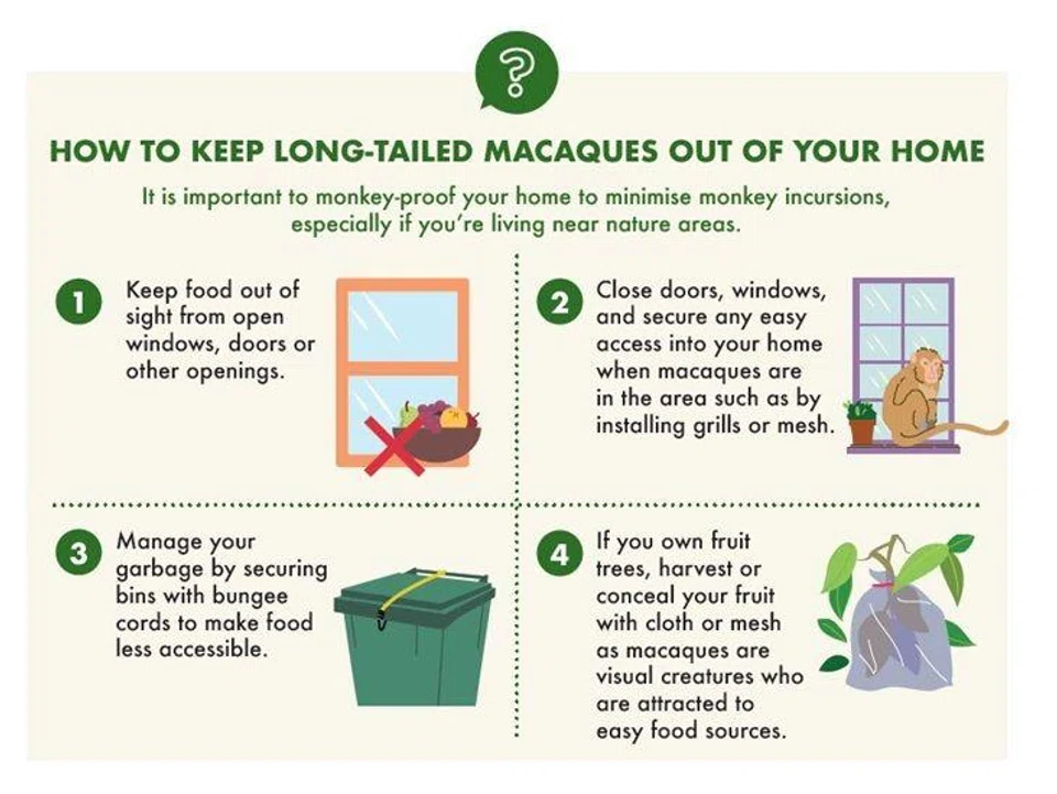 Here's how to keep long-tailed macaques out of your home, according to the National Parks Board website.