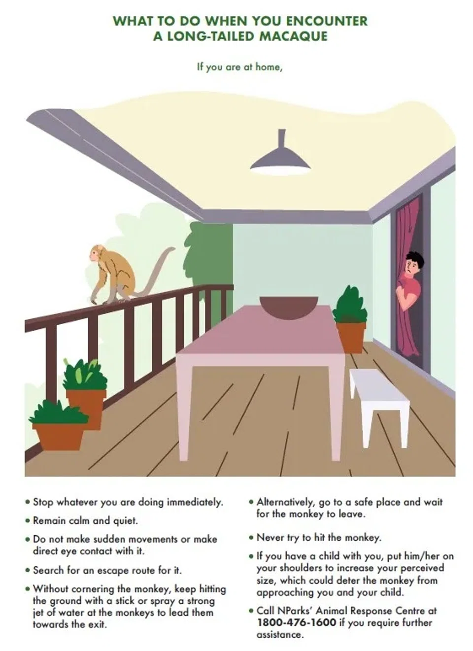"If macaques approach you in the open, remain calm and quiet and do not make any sudden movements or maintain eye contact with them. Instead, look away and back off slowly. Keep away from the area until they have left. Macaques also associate plastic bags with presence of food and will try to snatch it them upon sight. We advise members of public to keep plastic bags out of macaques' sight when spotted.