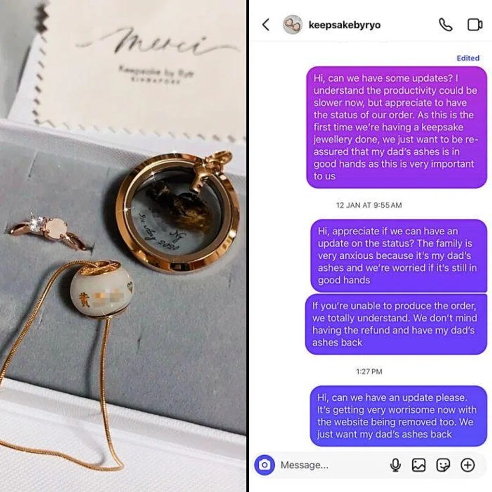 A woman entrusted a portion of her late father’s ashes to a shop to create keepsake jewellery, only to be heartbroken when the shop failed to deliver and the owner became uncontactable.