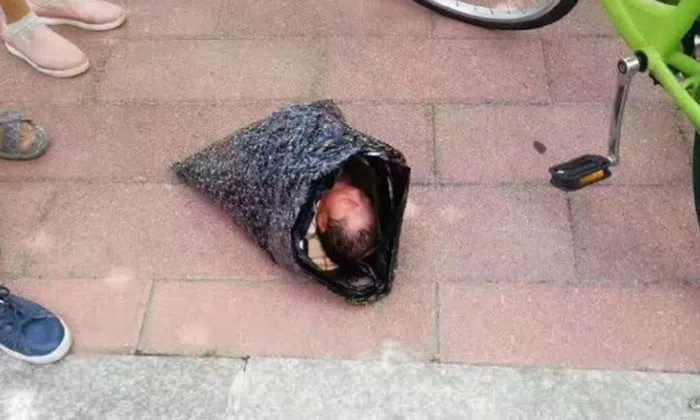 A video of a crowd gathering around the baby who was still wrapped in plastic went viral on Chinese social media.