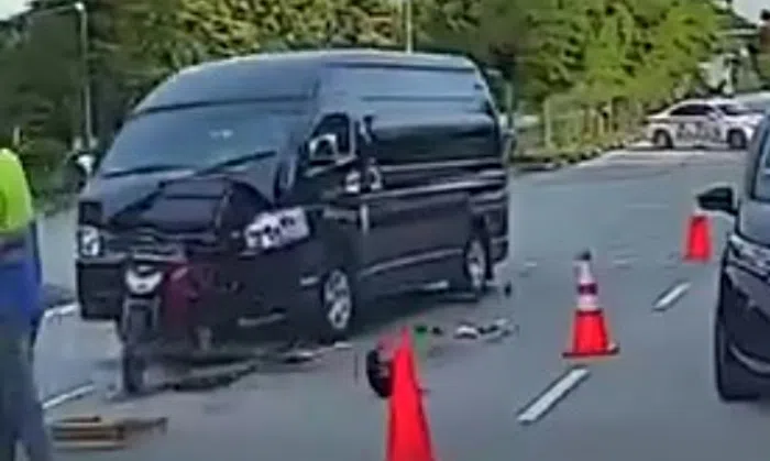 A video of the accident's aftermath posted on Facebook group Singapore roads accident.com shows a mangled motorcycle crumpled against the front of a minivan. A helmet, some debris and a pool of blood are on the road near the vehicles.