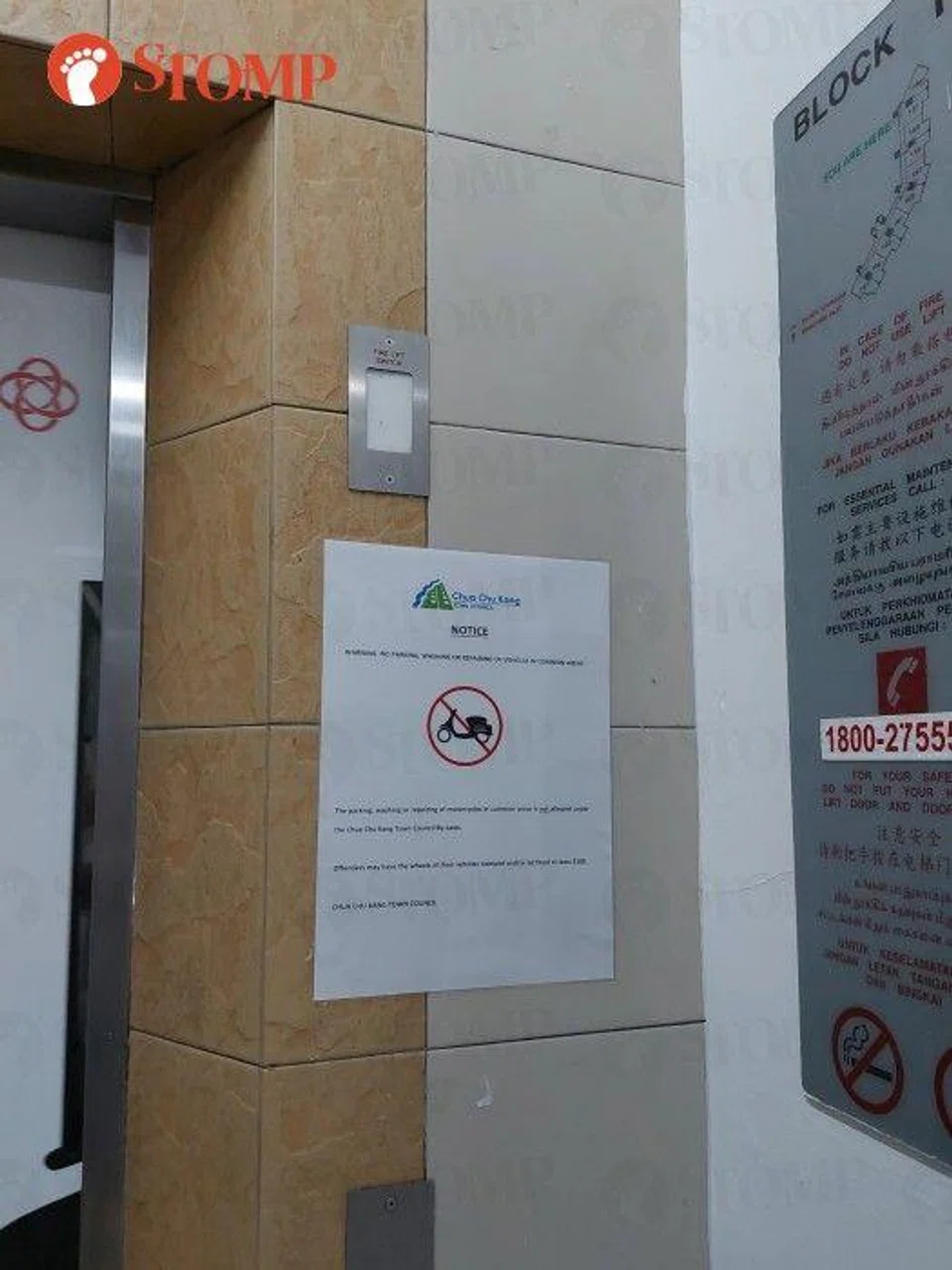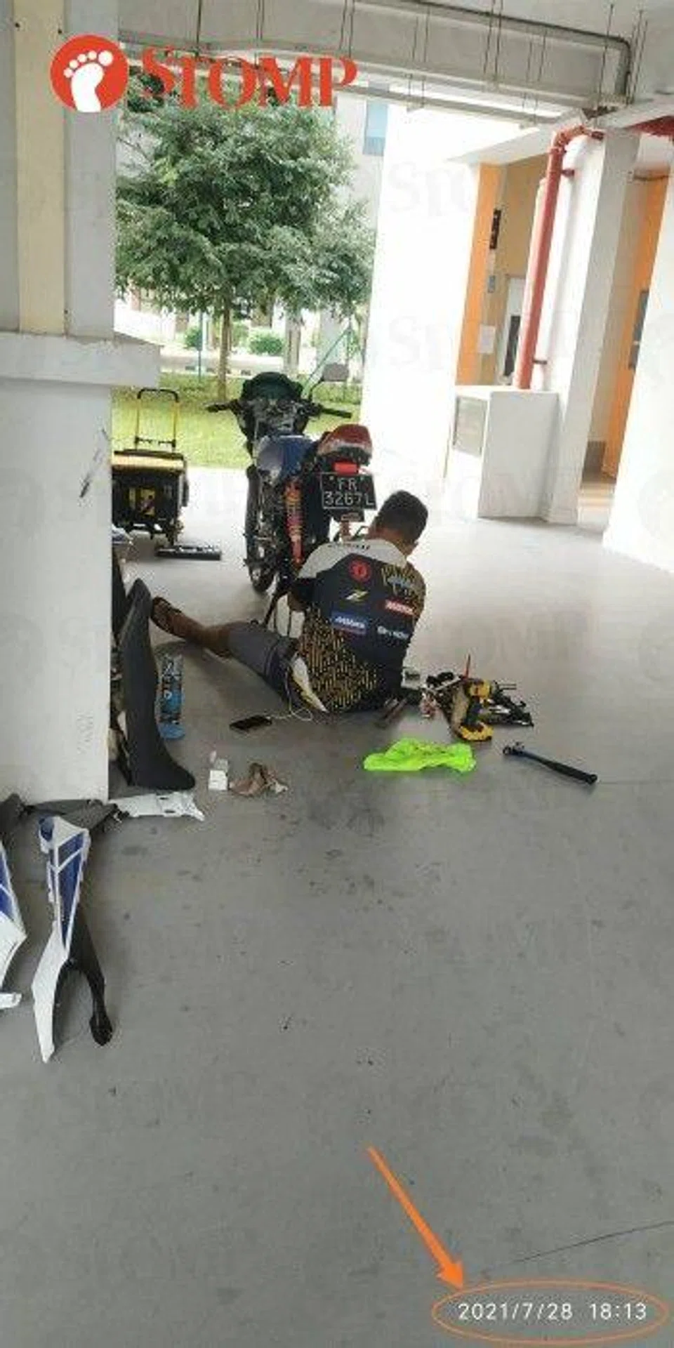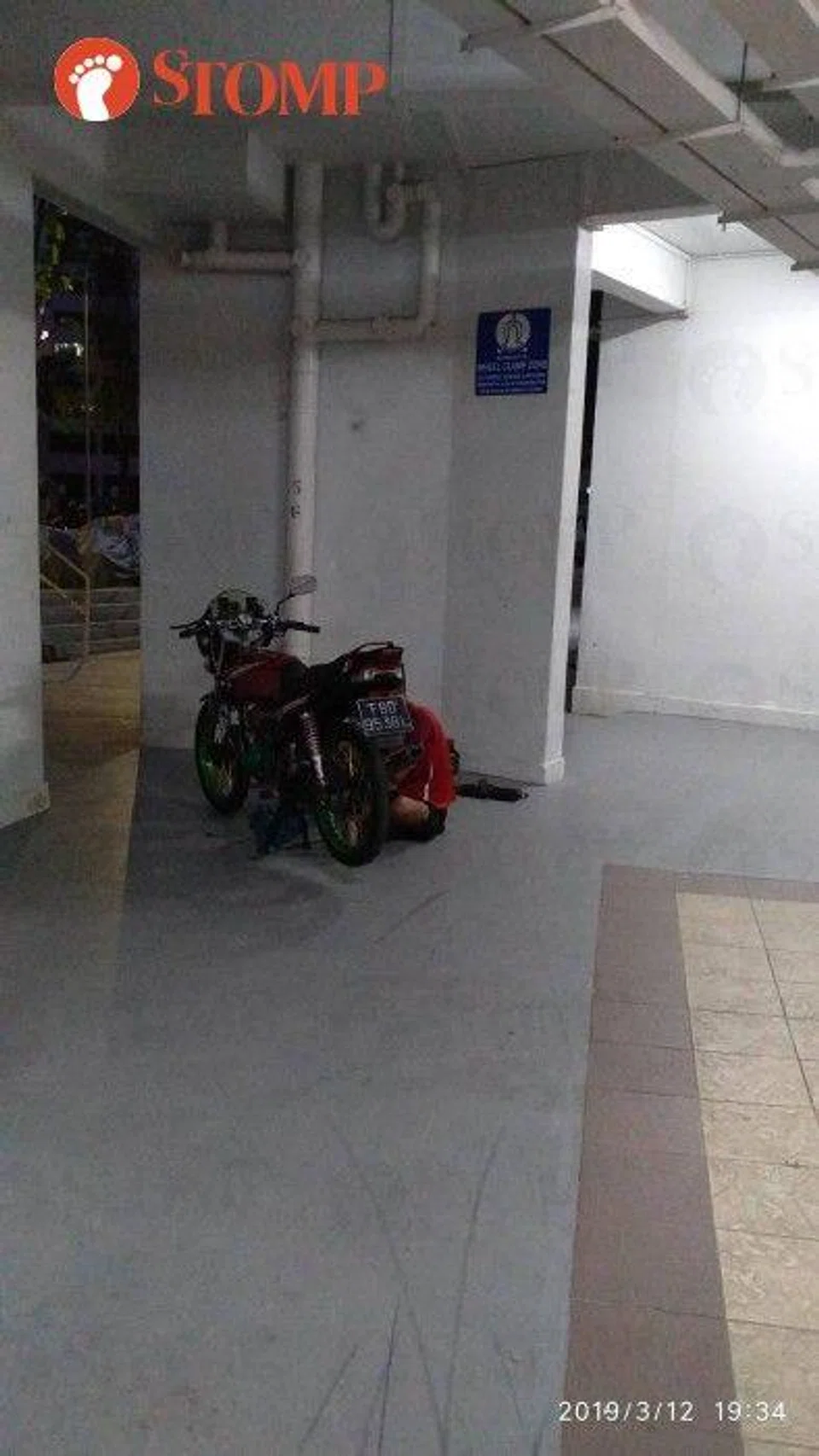 "The repair or parking of motorcycles at the void deck is not allowed under the town council by-laws. Signages are displayed prominently to warn against such activities.