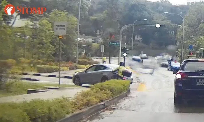 A video captured motorcyclist got side-swiped by his car as he was turning left into Camp Road from Tanglin Road on Oct 23 at 4.24pm.
