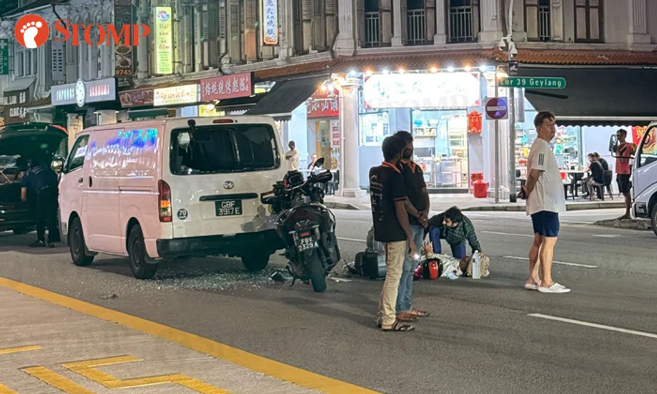 Motorcyclist lies on road, taken to hospital after accident with van in Geylang