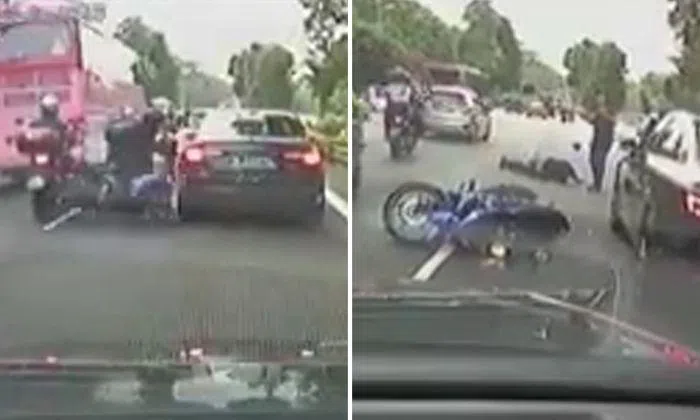 A video posted on Facebook page SG Road Vigilante shows the motorcyclist crashing into the rear of the Audi car and being flung onto the road.