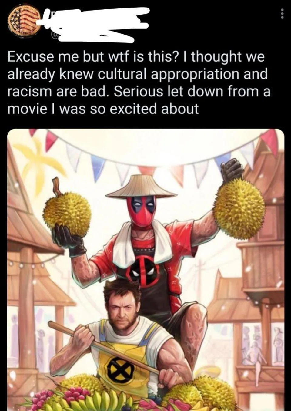 Movie poster of Deadpool holding durians accused of cultural appropriation, racism