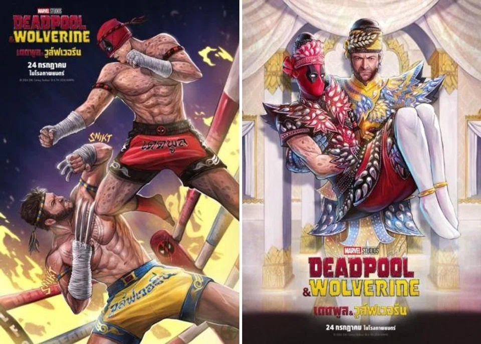 In the durian poster, Wolverine is rowing a boat filled with fruit in a floating market as Deadpool stood behind him wearing a traditional Thai ngob hat and holding up a durian in each gloved hand.