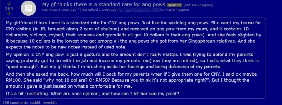 Frustrated by his girlfriend's unhappiness over an "insufficient" hongbao from his parents, a Malaysian man took to Reddit to seek the opinions of others on the matter.