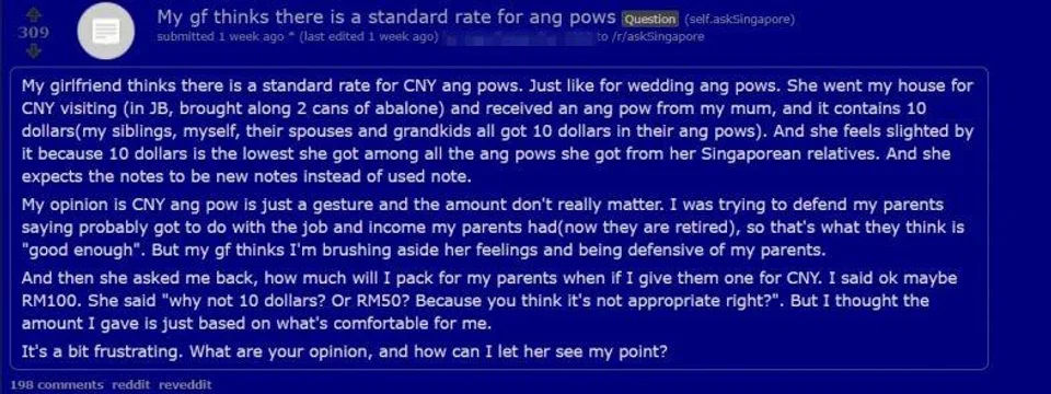 Frustrated by his girlfriend's unhappiness over an “insufficient” hongbao from his parents, a Malaysian man took to Reddit to seek the opinions of others on the matter.