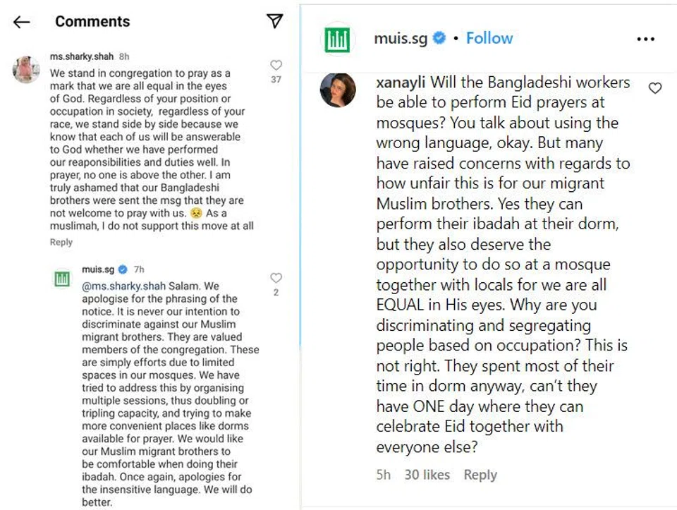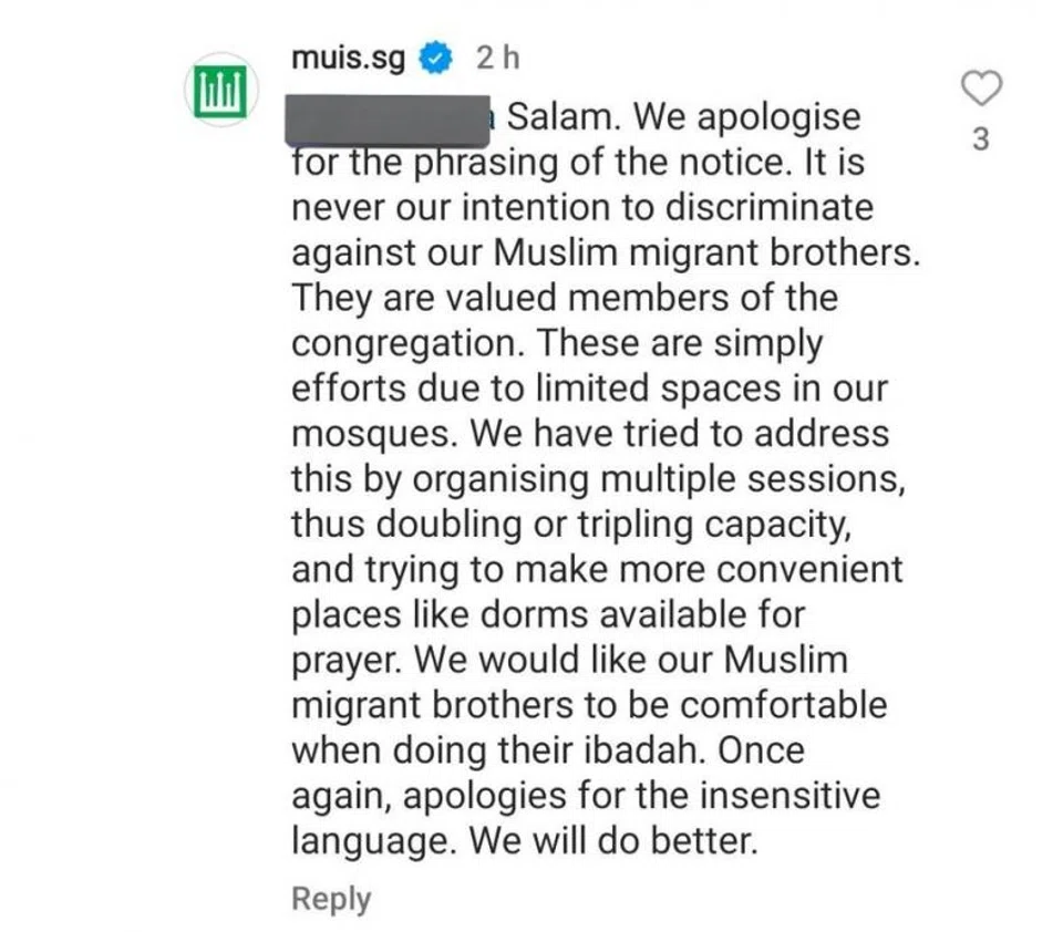 In response to the comments on their Instagram thread, Muis apologised for the "phrasing of the notice" during the late afternoon, saying they did not intend to "discriminate against our Muslim migrant brothers".