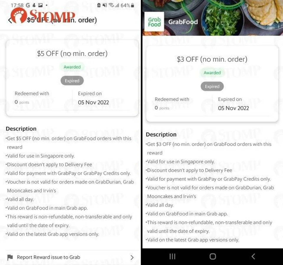 She recounted: "My daughter received two GrabFood vouchers from Grab with an expiry date on Nov 5, 2022.