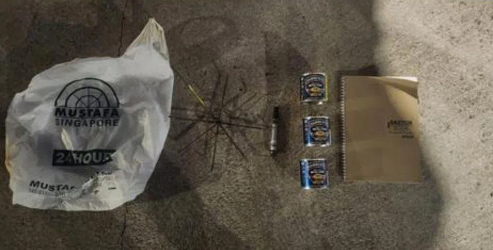 A plastic bag from Mustafa Centre, a metal pot holder, a black marker, three cans of paints and a notebook were seized as case exhibits.