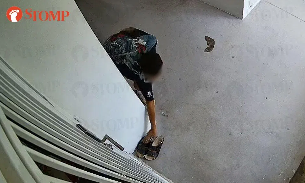 The CCTV footage shows a boy bending down and taking the sandals from outside the unit before walking away.