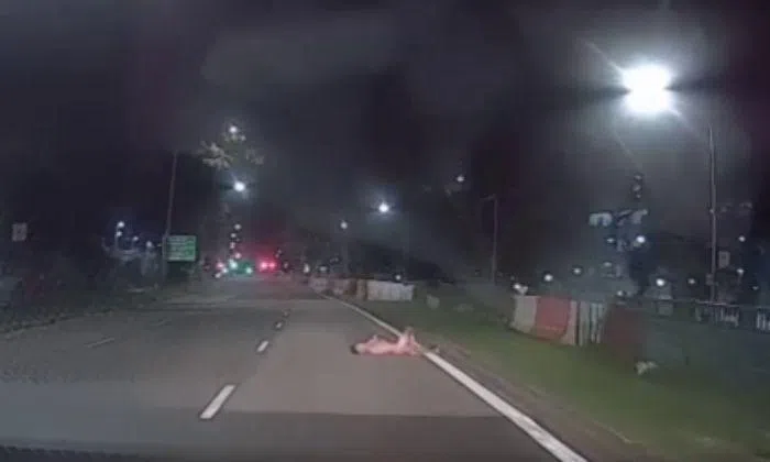 A 34-year-old man has been arrested after a video shows him lying naked on a road in Sembawang.