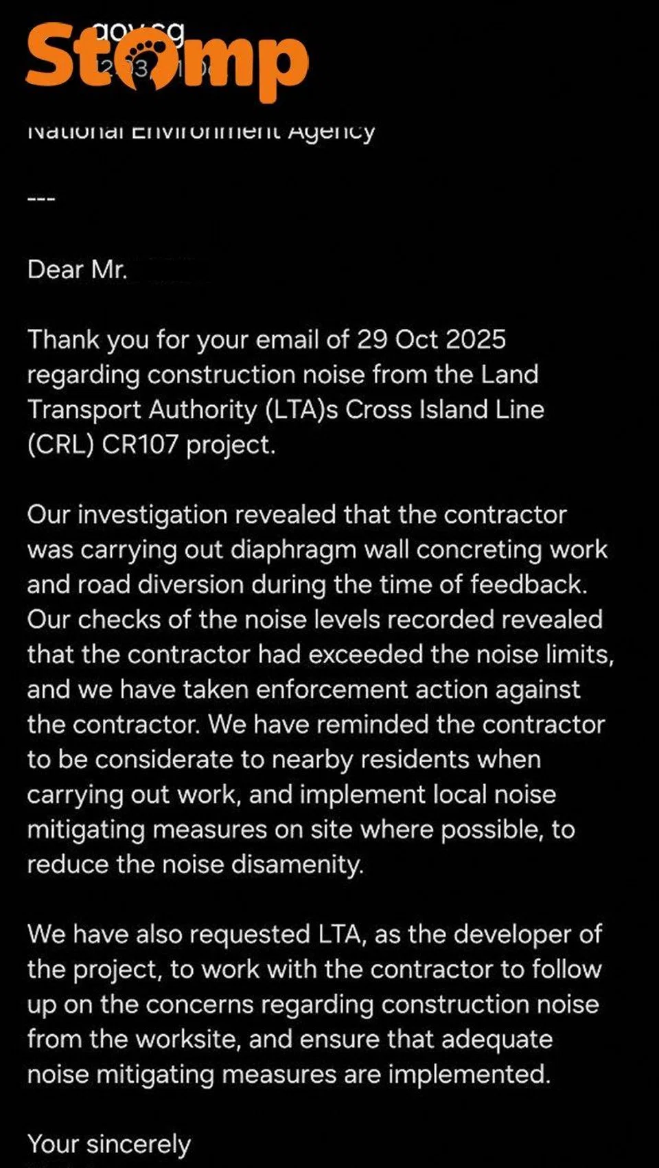 The Stomper wrote in to the National Environment Agency (NEA), who informed him that action had been taken against the contractor for exceeding permitted noise levels.