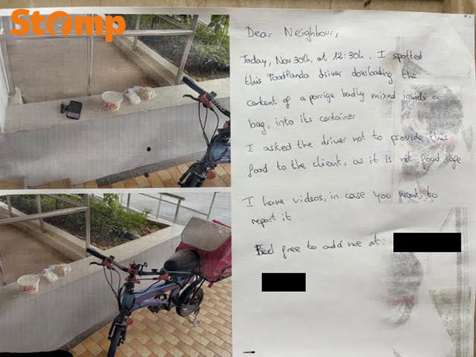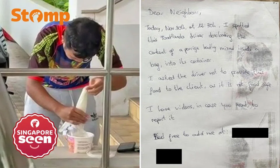 Neighbour's note alerts condo resident to GrabFood rider pouring spilt porridge back into container