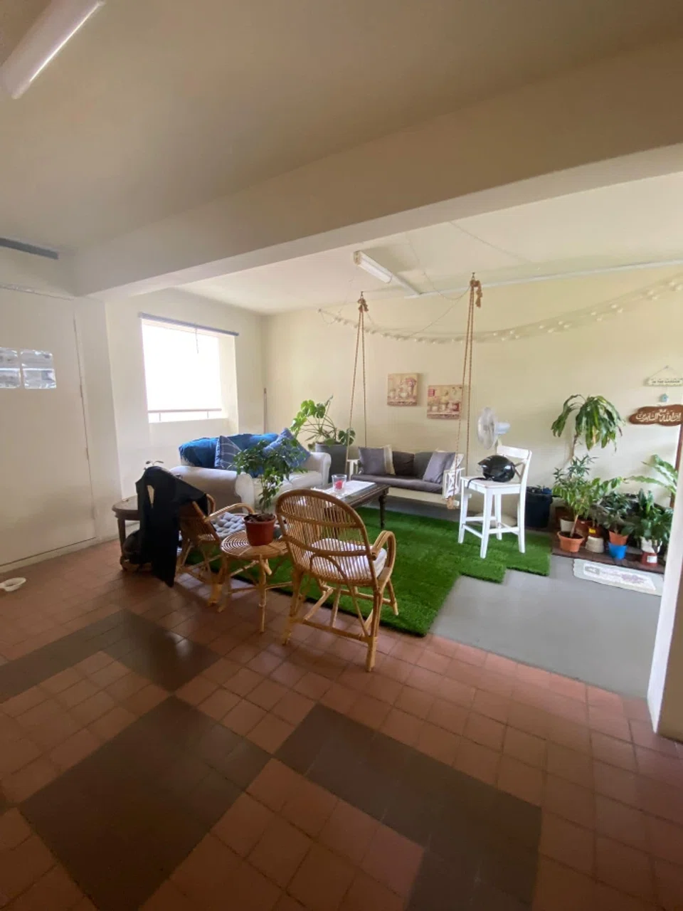 The floor is lined with artificial turf, there's a coffee table complete with a candle in a jar for ambience. At a corner is a cluster of potted plants and suspended from the ceiling is a swing with cushions on it. There is also a plush sofa with extra cushions on it.