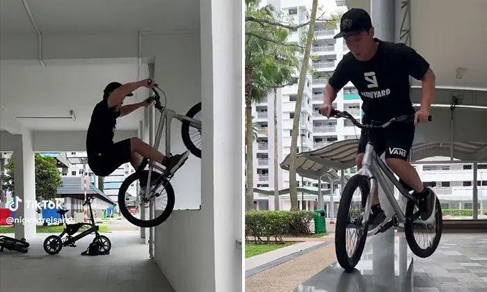 A youth was recorded doing stunts on a bike at an HDB block's void deck and multi-purpose hall.