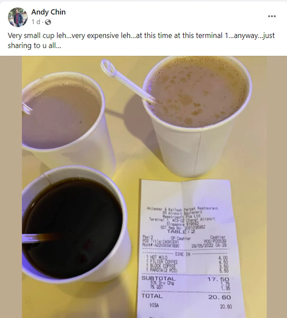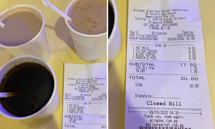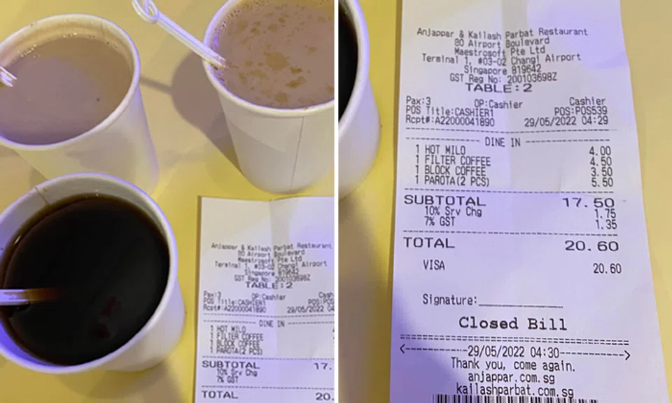 A diner took to the Complaint Singapore Facebook page to share his $20.60 bill at Anjappar Restaurant at Changi Airport's Terminal 1 on early Sunday morning (May 29).