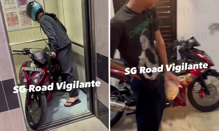 A video on SG Road Vigilante's Facebook page shows a motorcyclist wheeling his bike into a lift at a block in Teban Place on April 11.
