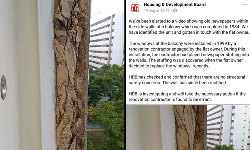 Netizens were concerned after a photo and a video showing newspapers being stuffed in a wall of an HDB flat was posted on Facebook recently.