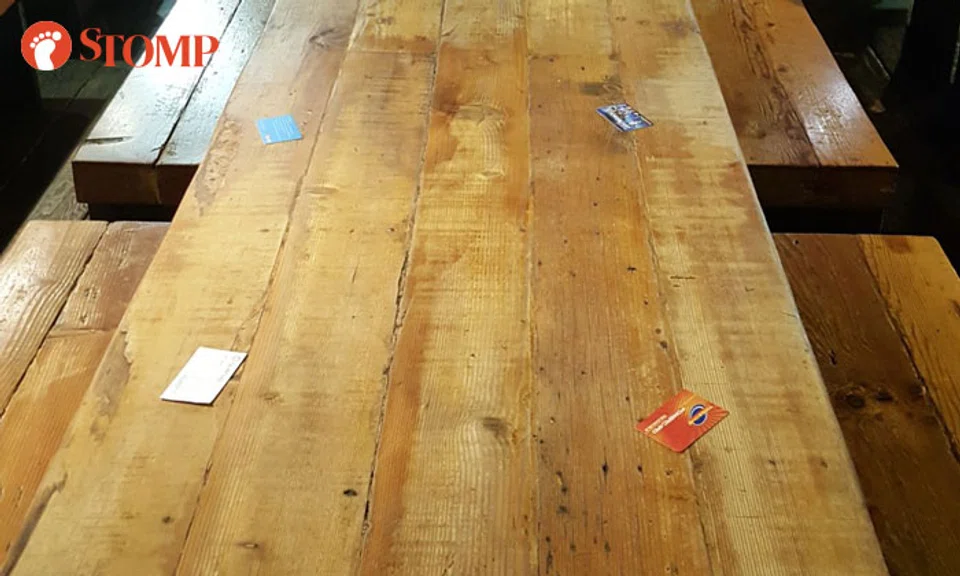 A Stomper saw a table with name cards and tissue packets spread around it at VivoCity's food court yesterday and was upset.