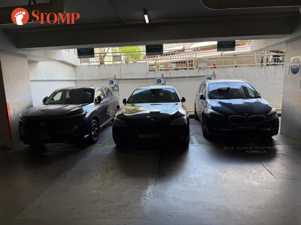 Stomper Melvin shared photo of not one, not two, but three non-EVs parked in charging lots in the basement carpark at Block 630 Bedok Reservoir.